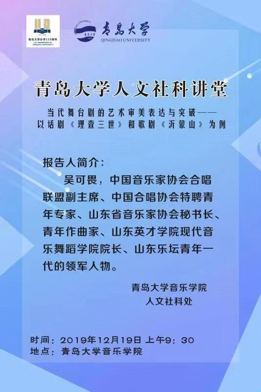 20191219日上午,由吴可畏主讲的《当代舞台剧的审美表达——以话剧<查理三世>、歌剧<沂蒙山>、舞剧<永不消逝的电波>为例》讲座在青岛大学音乐学院103排练厅成功举办。吴可畏,中国音乐家协会合唱联盟副主席、中国合唱协会特聘青年专家、山东省音乐家协会秘书长、青年作曲家、山东英才学院现代音乐舞蹈学院院长、山东乐坛青年一代领军人物。参加此次讲座的有音乐学院院长王静怡、音乐学院部分师生以及社会文艺评论爱好者等。